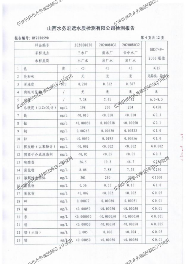 忻州城區(qū)公共供水水源水、出廠水、管網(wǎng)水、管網(wǎng)末梢水2020年8月份水質(zhì)信息公示