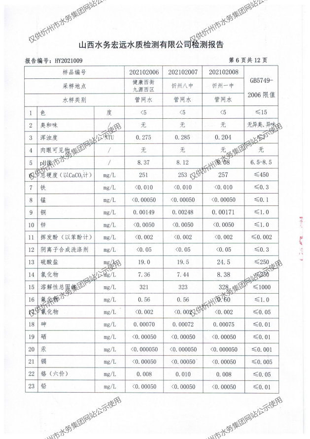 忻州城區(qū)公共供水水源水、出廠水、管網(wǎng)水、管網(wǎng)末梢水2021年2月份水質信息公示